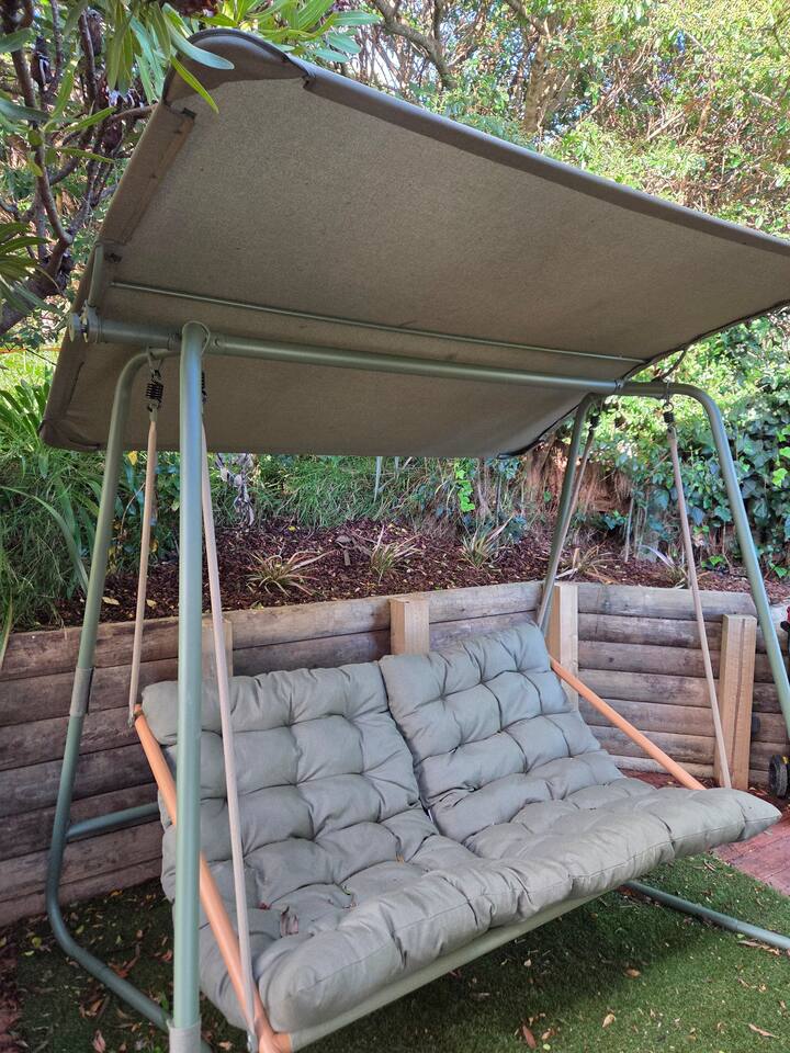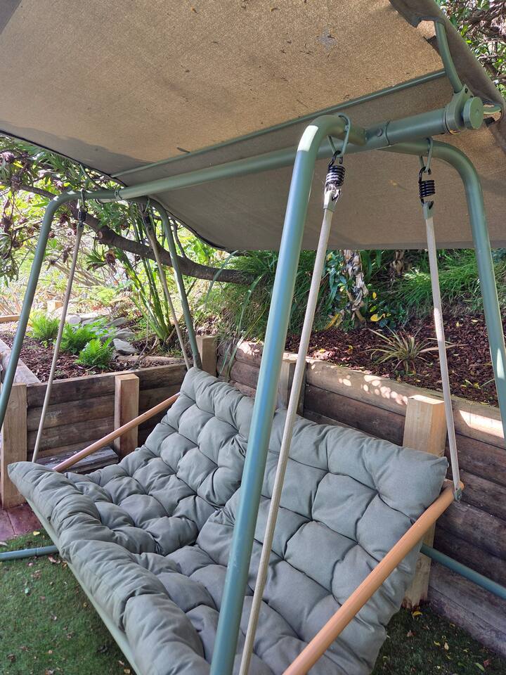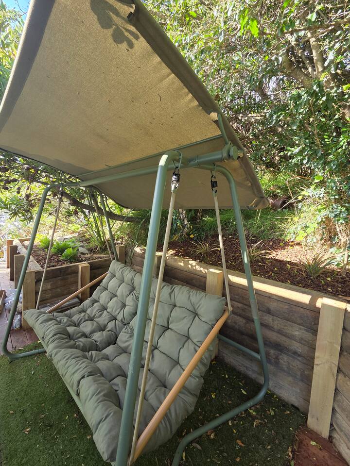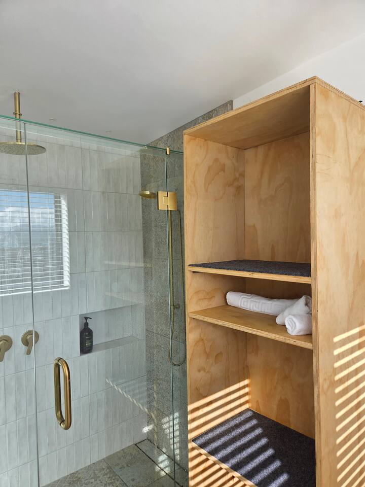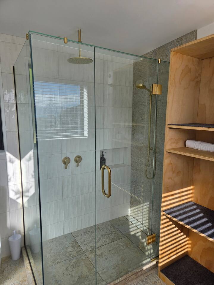 The Landing is reached by foot only via a series of outdoor stairways and boardwalks that wind through native ferns and gardens, past a waterfall and the Mid Wellness level. The route includes rest spots and seating along the way and totals 65 steps from the street to the dwelling. The journey is enchanting, especially at night with colorful LEDs lighting guiding your way. For safety and comfort this property is not suitable for guests with mobility impairments, infants in prams, or anyone who has difficulty with stairs. If you’d like, we can recommend more accessible accommodation nearby. Please note: There is no driveway or dedicated parking at the dwelling; plenty of street parking is available.