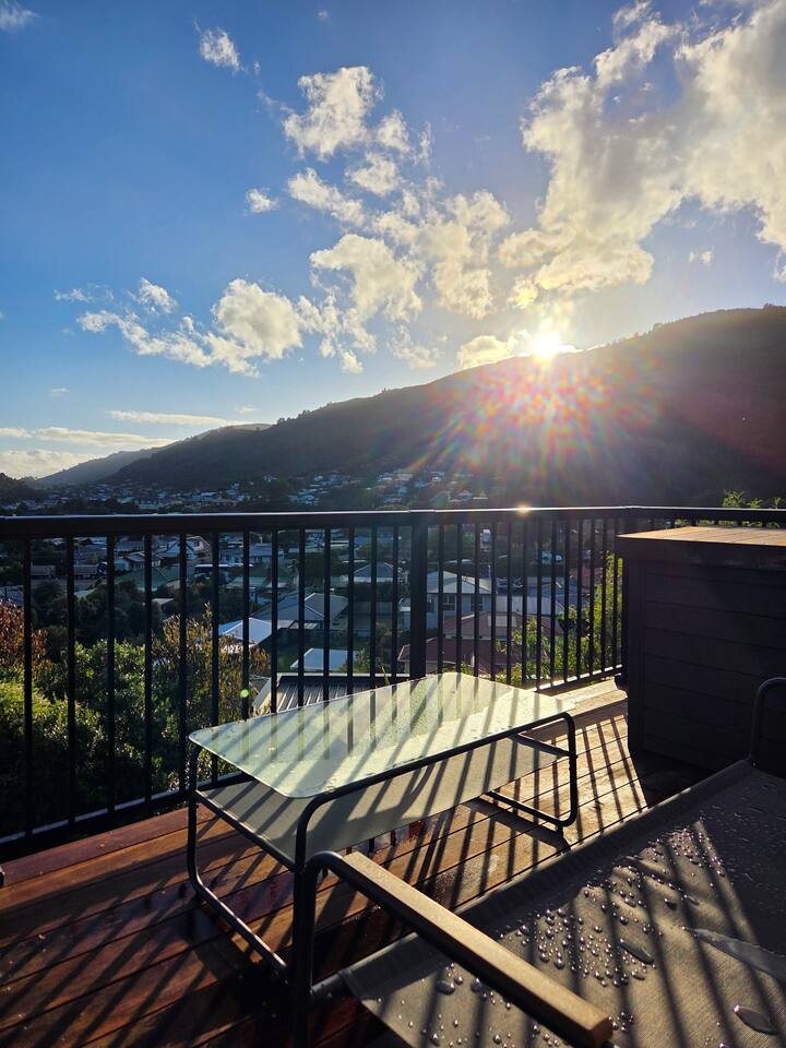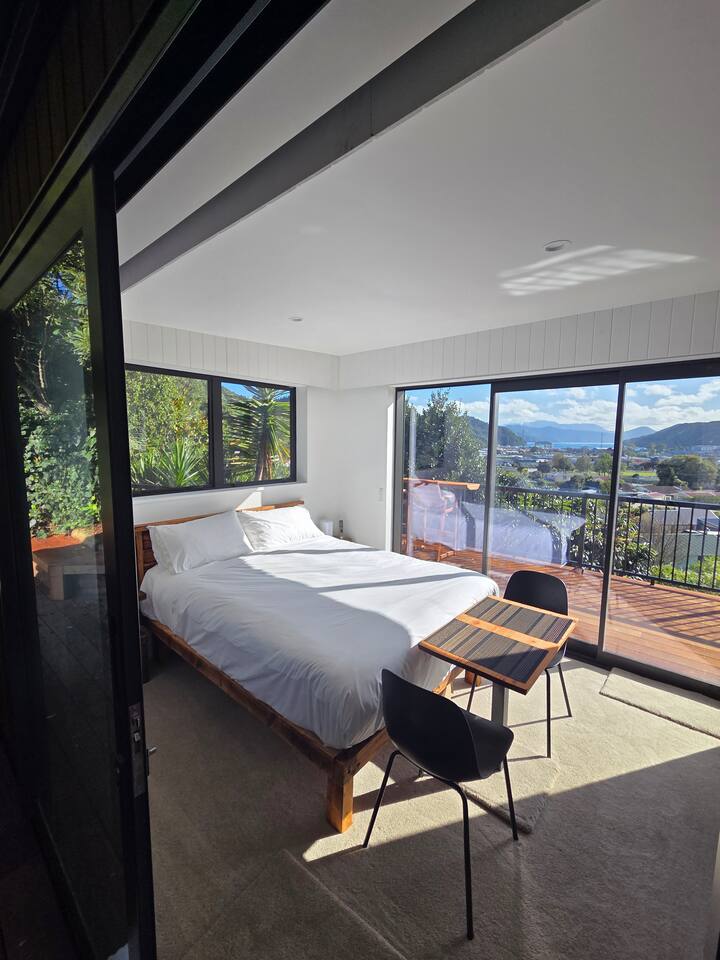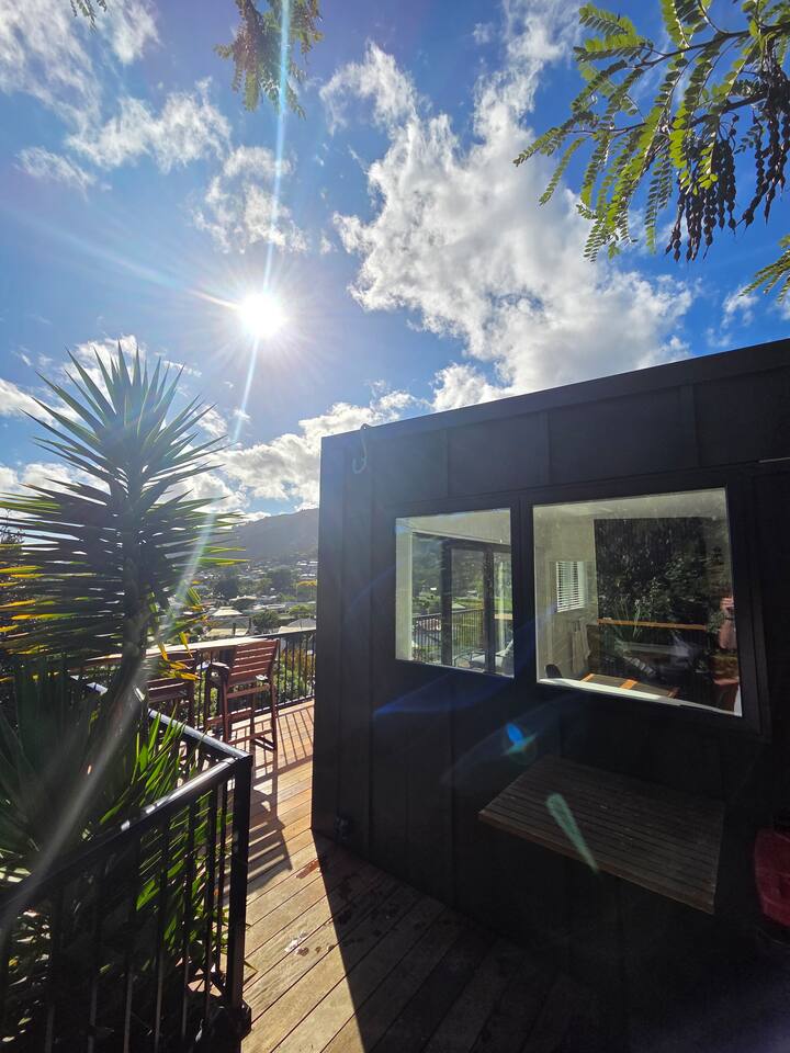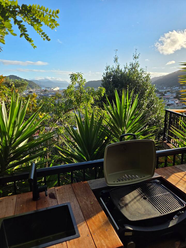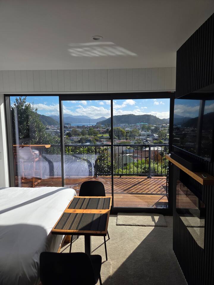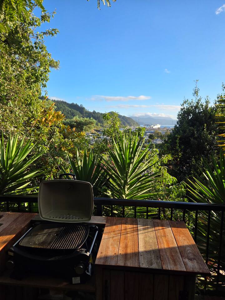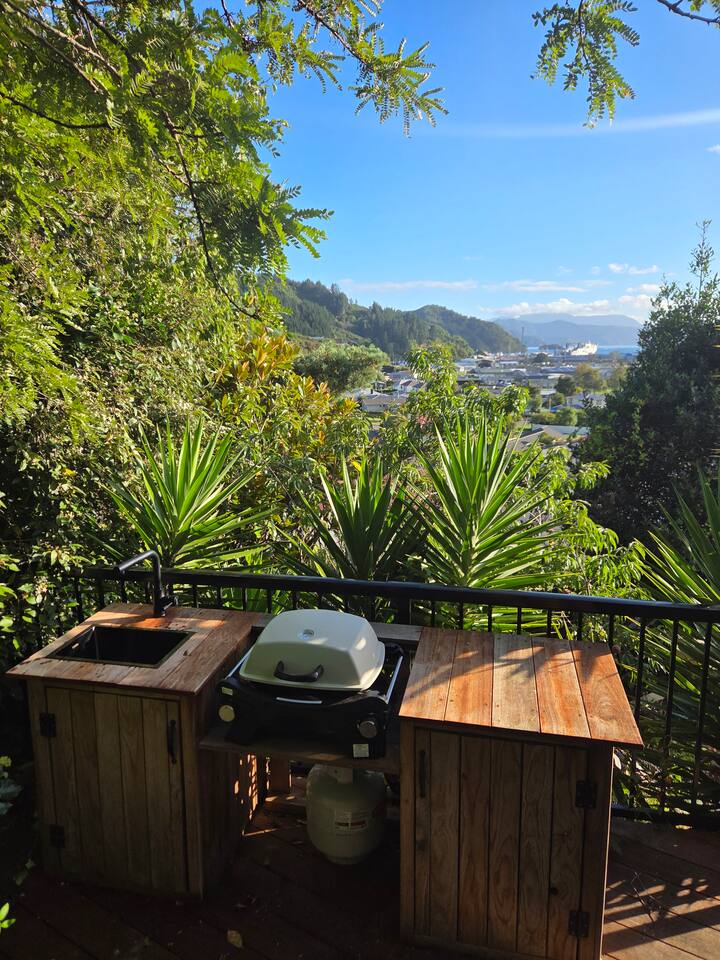 Welcome to The Landing, a newly finished top-level dwelling in Picton with sweeping harbour and township views to watch the Interislander arrive from the outdoor couch. Bright, modern and thoughtfully designed for relaxation, this 20m² compact retreat features 45 m² of wraparound decking making it feel extra spacious with an outdoor BBQ kitchenette, perfect for alfresco meals and sunsets. The unique swing seat lets you gently sway while enjoying the view through the dwelling while maintaining privacy. Inside you'll find an award winning queen bed a luxurious high-end bathroom with a 1200 x 1500mm twin-head his & her shower, an electric fireplace, air conditioning, motorised blinds, Samsung Smart TV, a Sonos Soundbar with Alexa that you can use to control all the lighting and blinds. There's a mini-fridge, coffee machine with supplied pods and microwave to make shorter stays effortless.