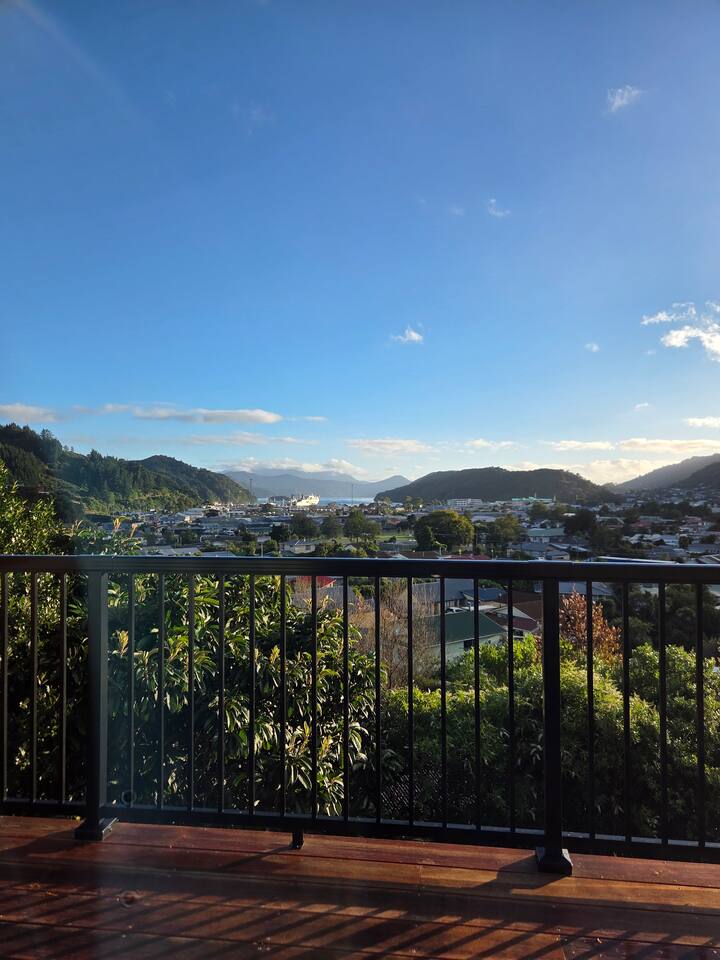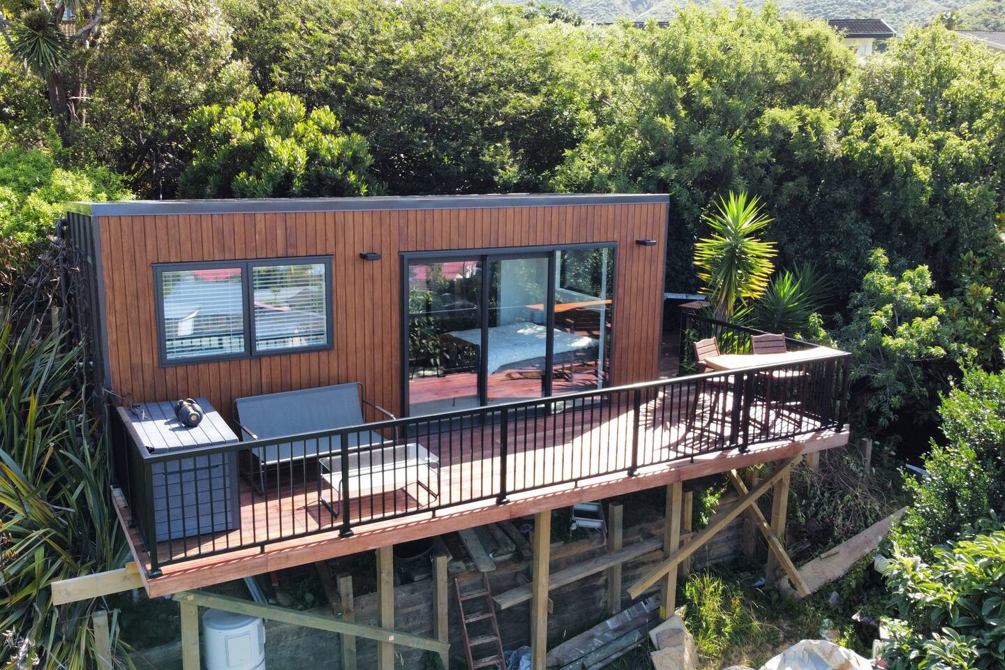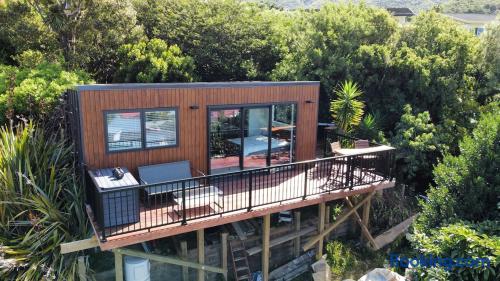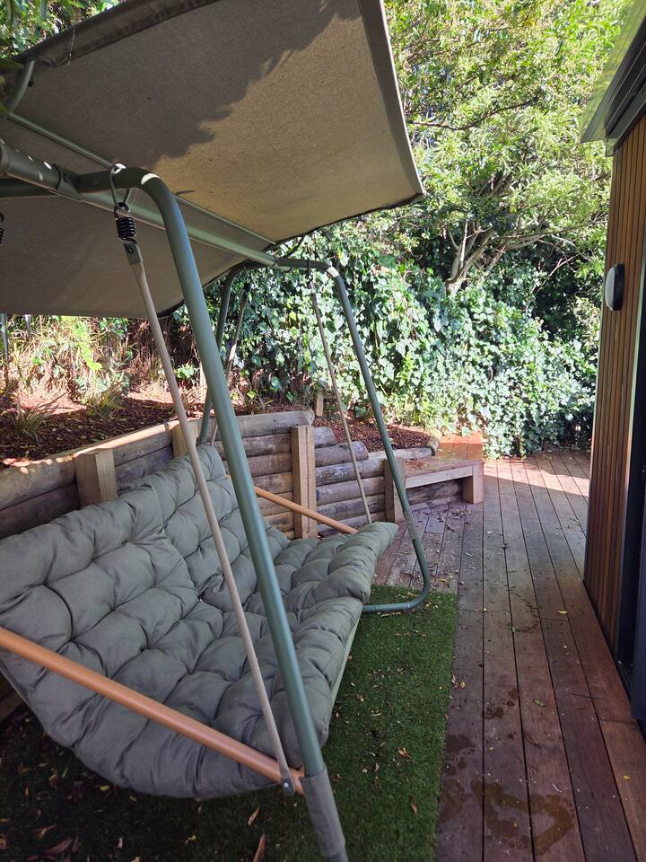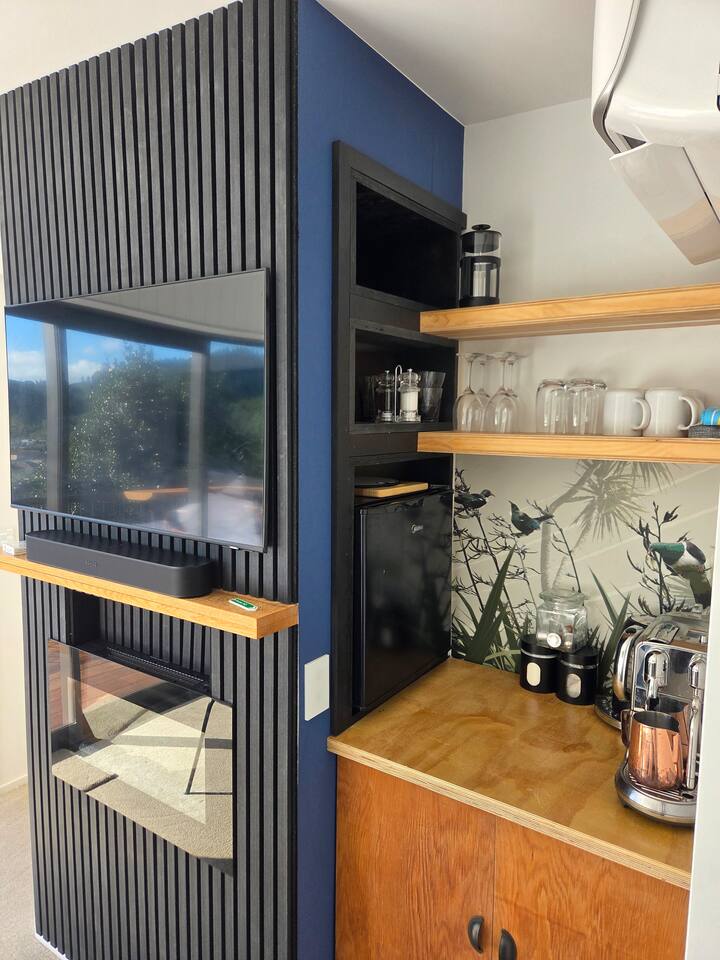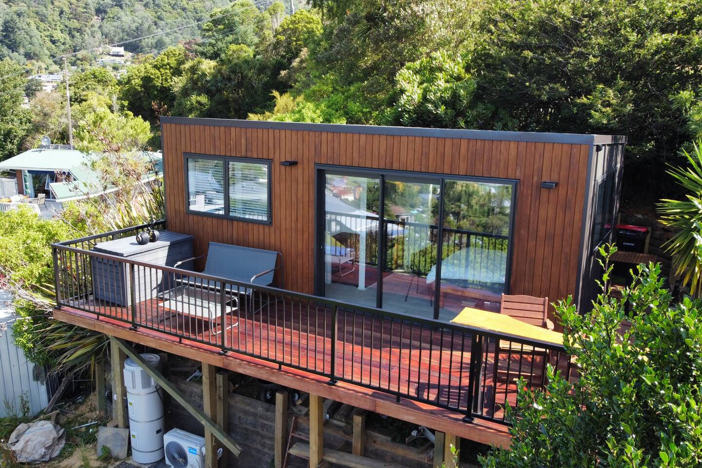 Welcome to The Landing, a newly finished top-level dwelling in Picton with sweeping harbour and township views to watch the Interislander arrive from the outdoor couch. Bright, modern and thoughtfully designed for relaxation, this 20m² compact retreat features 45 m² of wraparound decking making it feel extra spacious with an outdoor BBQ kitchenette, perfect for alfresco meals and sunsets. The unique swing seat lets you gently sway while enjoying the view through the dwelling while maintaining privacy. Inside you'll find an award winning queen bed a luxurious high-end bathroom with a 1200 x 1500mm twin-head his & her shower, an electric fireplace, air conditioning, motorised blinds, Samsung Smart TV, a Sonos Soundbar with Alexa that you can use to control all the lighting and blinds. There's a mini-fridge, coffee machine with supplied pods and microwave to make shorter stays effortless.