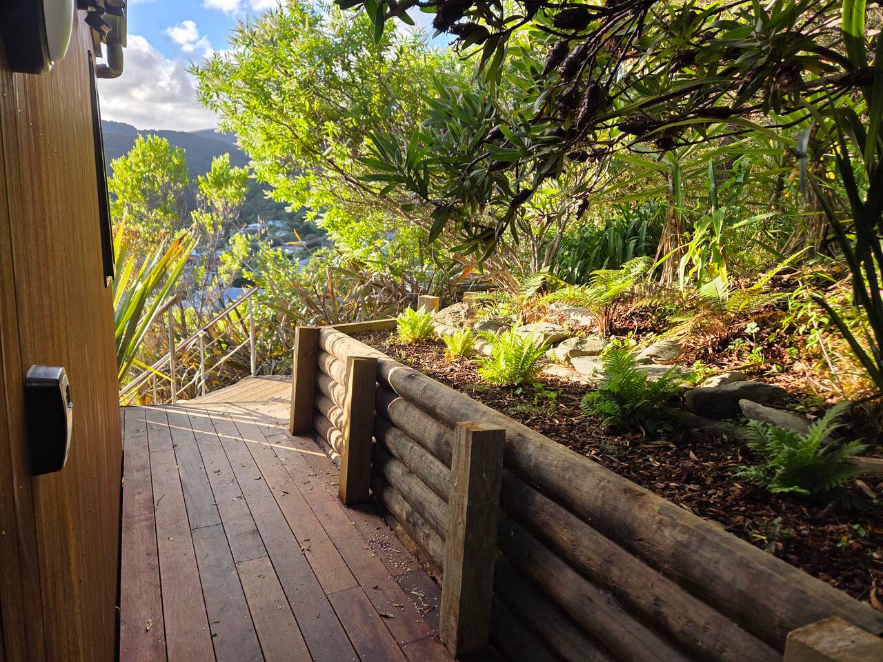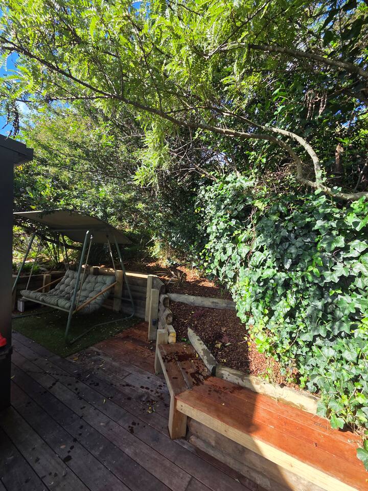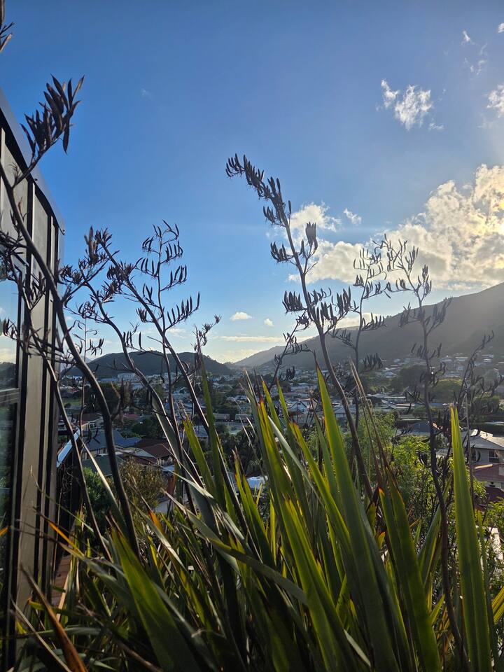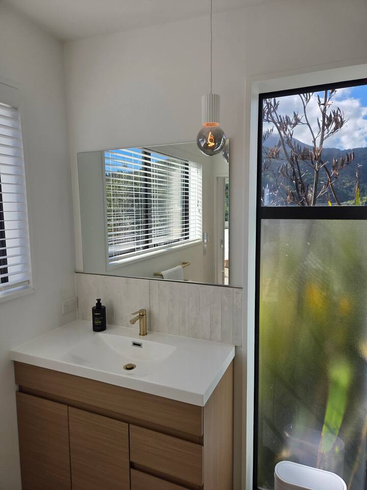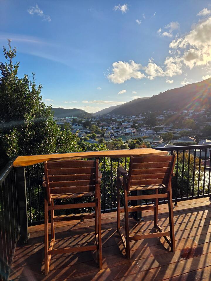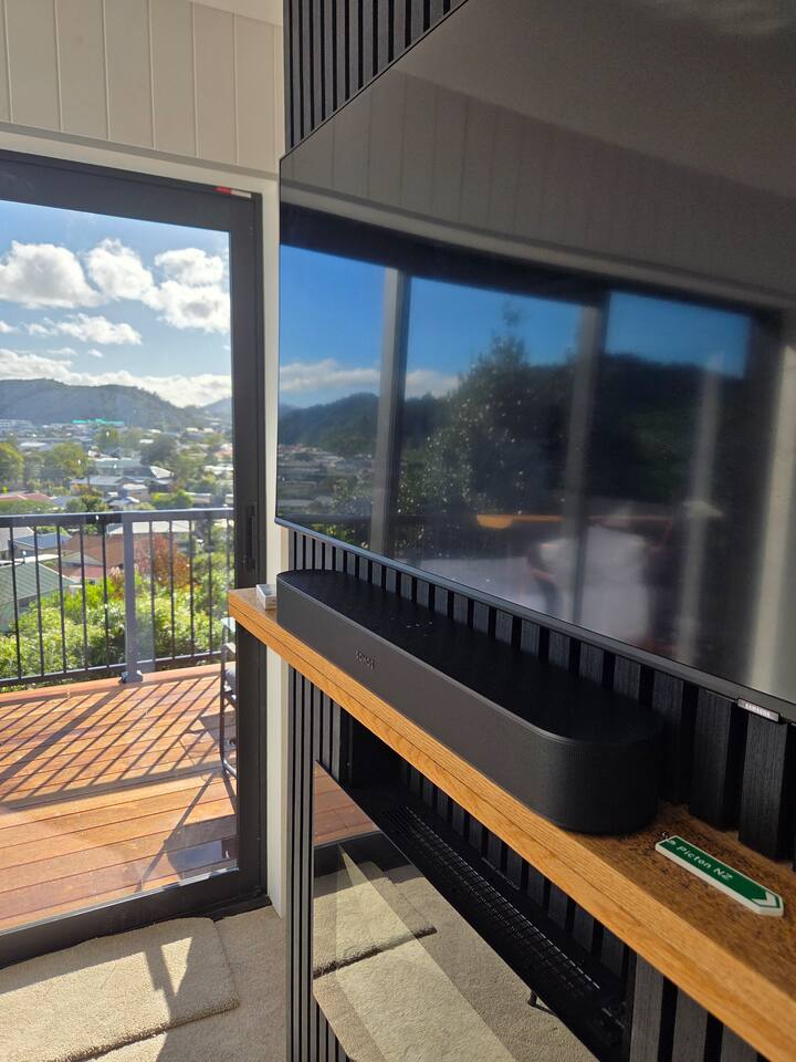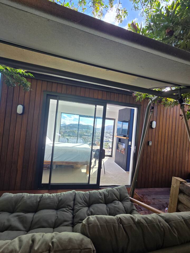 Welcome to The Landing, a newly finished top-level dwelling in Picton with sweeping harbour and township views to watch the Interislander arrive from the outdoor couch. Bright, modern and thoughtfully designed for relaxation, this 20m² compact retreat features 45 m² of wraparound decking making it feel extra spacious with an outdoor BBQ kitchenette, perfect for alfresco meals and sunsets. The unique swing seat lets you gently sway while enjoying the view through the dwelling while maintaining privacy. Inside you'll find an award winning queen bed a luxurious high-end bathroom with a 1200 x 1500mm twin-head his & her shower, an electric fireplace, air conditioning, motorised blinds, Samsung Smart TV, a Sonos Soundbar with Alexa that you can use to control all the lighting and blinds. There's a mini-fridge, coffee machine with supplied pods and microwave to make shorter stays effortless.