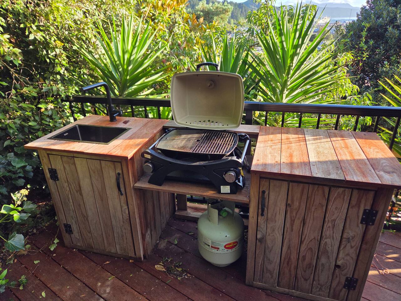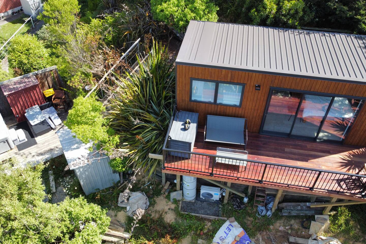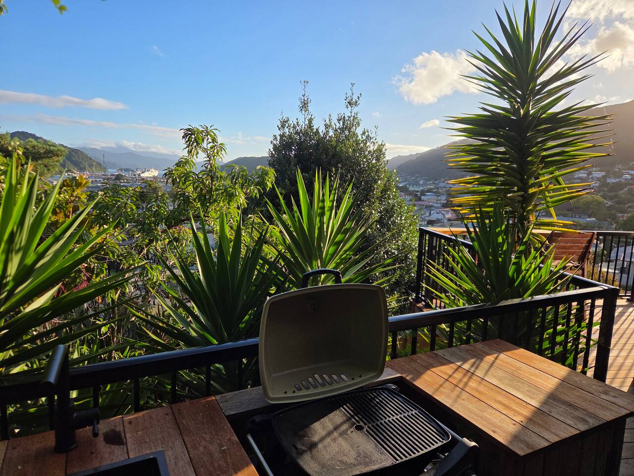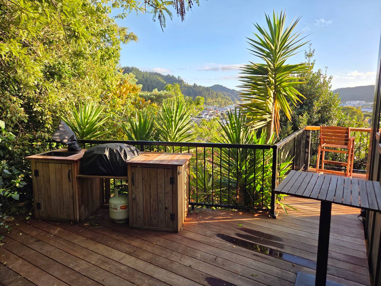 Welcome to The Landing, a newly finished top-level dwelling in Picton with sweeping harbour and township views to watch the Interislander arrive from the outdoor couch. Bright, modern and thoughtfully designed for relaxation, this 20m² compact retreat features 45 m² of wraparound decking making it feel extra spacious with an outdoor BBQ kitchenette, perfect for alfresco meals and sunsets. The unique swing seat lets you gently sway while enjoying the view through the dwelling while maintaining privacy. Inside you'll find an award winning queen bed a luxurious high-end bathroom with a 1200 x 1500mm twin-head his & her shower, an electric fireplace, air conditioning, motorised blinds, Samsung Smart TV, a Sonos Soundbar with Alexa that you can use to control all the lighting and blinds. There's a mini-fridge, coffee machine with supplied pods and microwave to make shorter stays effortless.